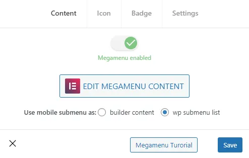 Click the EDIT MEGAMENU CONTENT button to enter the Elementor editor.